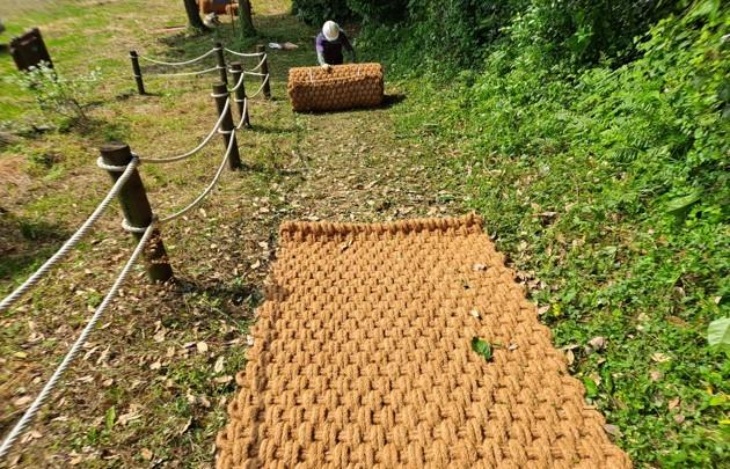 서귀포시가 23억원을 투입, 4월부터 오름 16개소의 노후화 시설에 대한 정비사업에 나선다. 오름 탐방로 매트 교체 모습. 서귀포시 제공