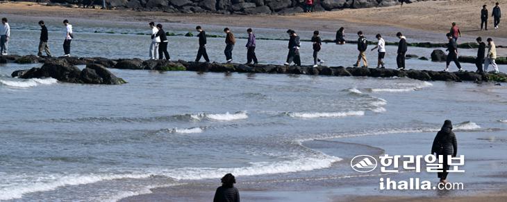 [한라일보] 완연한 봄날씨를 보인 24일 제주시 이호해수욕장을 찾은 관광객들이 원담 걷기 체험을 하고 있다. 강희만기자