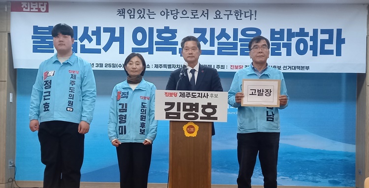 [한라일보] 김명호 진보당 제주도지사 예비후보는 최근 불거진 정무 라인을 구성하는 별정직 공무원들의 선거 개입 의혹에 대해 이와 연루된 전·현직 공무원 및 관련자를 공직선거법 위반 혐의로 고발했다.