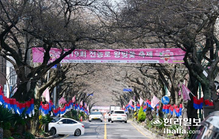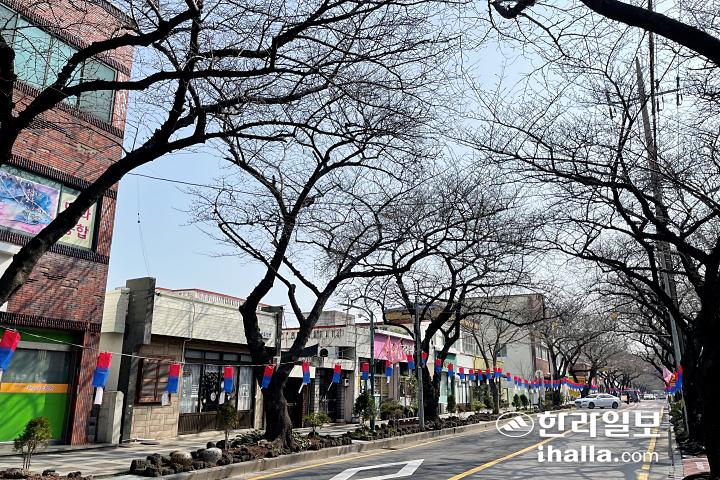 26일 제주시 삼도1동의 전농로 왕벚꽃거리. 벚꽃축제를 하루 앞뒀지만 벚꽃이 개화하지 않았다. 강희만기자
