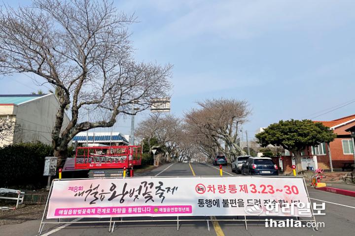 26일 제주시 애월읍 장전리 왕벚꽃거리. 이틀 뒤 벚꽃축제가 열리지만 마찬가지로 벚꽃이 개화하지 않았다. 양유리기자