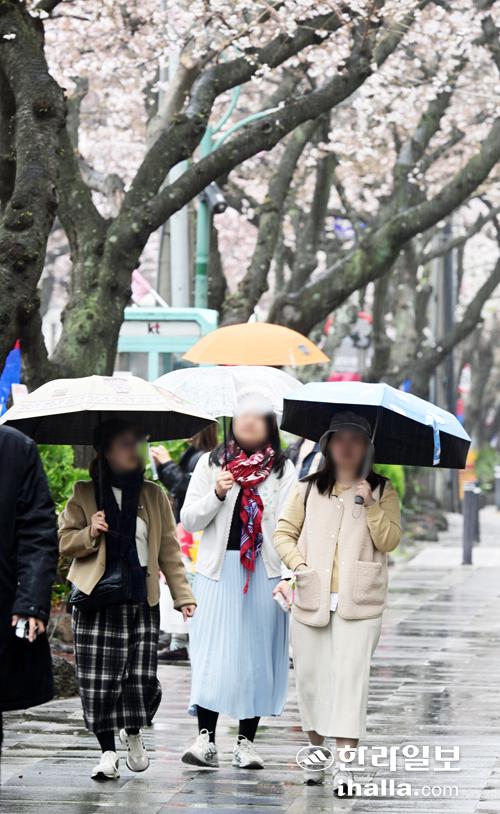 [한라일보] 봄비가 내린 30일 제주시 삼도1동 전농로를 찾은 시민들이 우산을 쓰고 벚꽃길을 산책하고 있다.