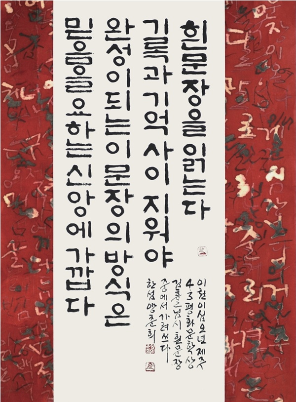 양춘희 출품작. 제주4·3평화문학상 수상작 김휼의 '흰 문장' 일부를 썼다. 한글서예묵연회 제공