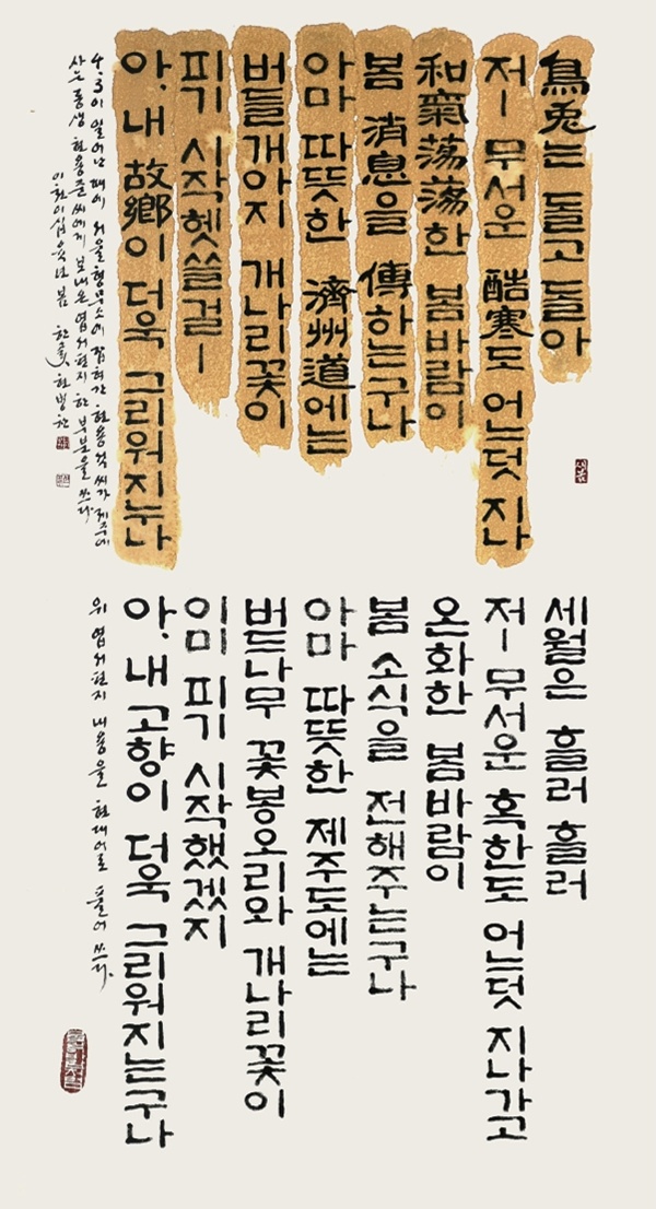 현병찬 출품작. 4·3수형인 엽서글을 한글 서예에 담았다. 한글서예묵연회 제공