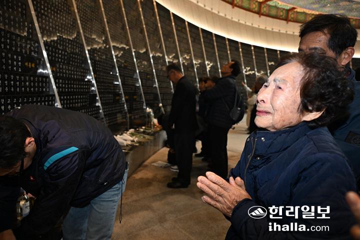 [한라일보] 제78주년 제주4·3희생자 추념일인 3일 오전 제주시 봉개동 제주4·3평화공원 내 행방불명인 표석과 위패봉안실을 찾은 유족이 희생자를 추모하며 안타까워 하고 있다.