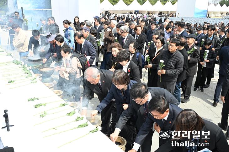 제주4·3평화공원에서 거행된 제78주년 4·3희생자 추념식에서 도민과 유족들이 헌화하고 있다. 강희만 기자