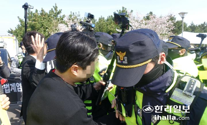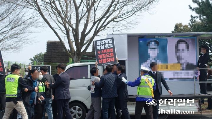 3일 오전 제78주년 4·3 추념식이 열린 제주4·3평화공원 앞에서 일부 극우 유튜버들과 4·3단체가 동시에 집회를 진행하면서 경찰이 충돌을 막고 있다. 양유리기자