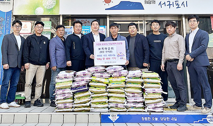 서귀포시 송산동 보목마을회(회장 한석용)는 지난 2일 송산동주민센터를 방문해 보목마을회 회장단 이·취임식에서 받은 쌀 10㎏ 50포를 송산동주민센터(동장 홍기확)에 기탁했다.