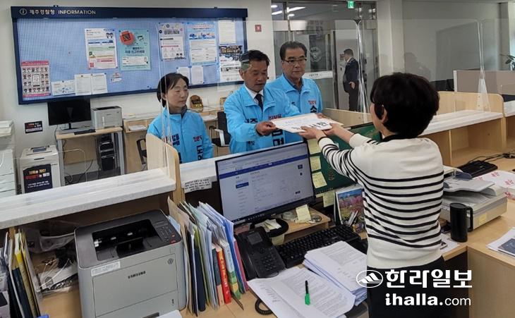 김명호 진보당 제주도지사 예비후보가 6일 제주경찰청을 찾아 도지사 선거를 둘러싼 관권선거 의혹과 관련해 강제수사를 촉구하는 항의 서한을 전달하고 있다. 박소정기자