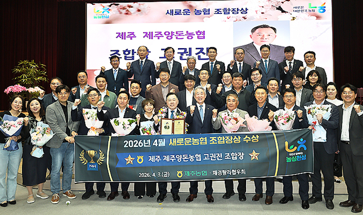제주양돈농협 고권진 조합장이 지난 3일 농협중앙회 본관에서 열린 '2026년 새로운 농협 조합장' 시상식에서 우수 조합장으로 선정됐다. '새로운 농협 조합장상'은 농협 혁신과 지역사회 발전에 기여한 조합장을 발굴·격려하기 위해 마련된 상이다.