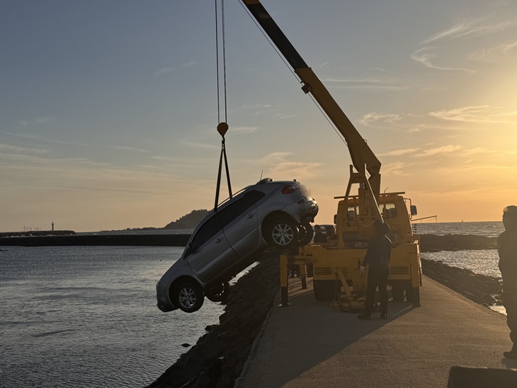 방파제에서 바다로 추락한 차량을 인양하는 모습. 제주해양경찰서 제공