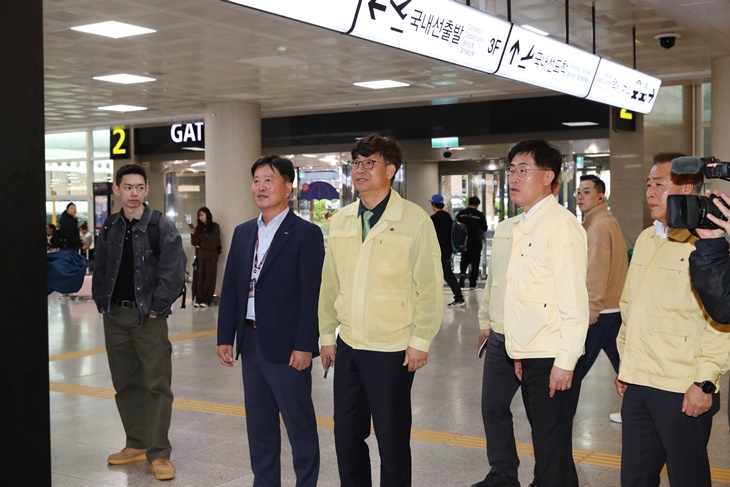 제주도가 9일 강풍에 따른 재난안전대책본부 비상 1단계 근무에 돌입한 가운데, 박천수 제주도지사 권한대행이 제주국제공항을 찾아 항공기 운항 현황과 이용객 안전대책을 점검했다. 제주도 제공