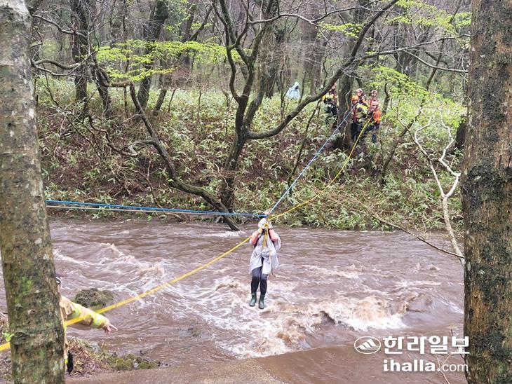 하천 범람에 고립된 숲길 탐방객들을 구조하는 119 소방대원들. 제주도소방안전본부 제공