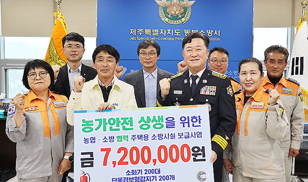 [한라일보] 제주동부소방서(서장 강성부)는 지난 9일 성산일출봉농협(조합장 박명종) 및 성산·신산의용소방대(대장 박우철·홍순미·이충흡·김연자)와 협력해 지역 농가와 취약계층의 화재 예방을 위한'주택용 소방시설 협력 보급사업' 행사를 개최했다.