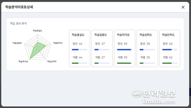 플랫폼 '바당'이 제공하는 학습분석리포트. 이처럼 교사는 학생의 학습 충실도와 집중도, 적극성, 성취도, 만족도가 담긴 학습분석리포트를 도표와 개별 점수로 확인할 수 있다. 제주도교육청 제공
