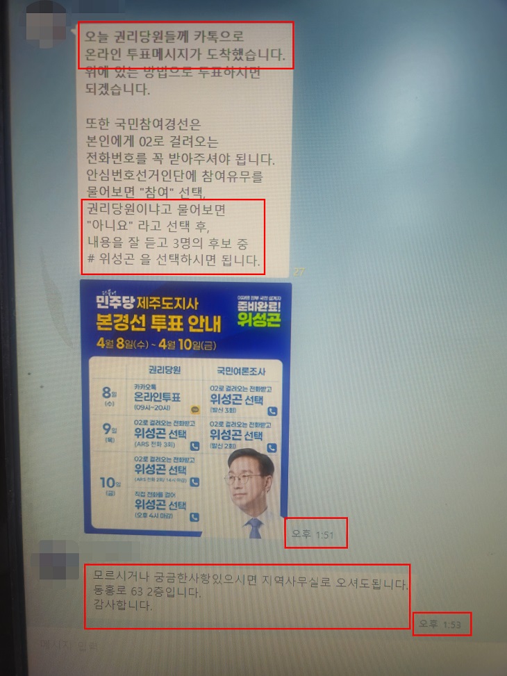 더불어민주당 제주지사 문대림 경선 후보 측이 공개한 카카오톡 대화방 사진. 문 후보 측은 위성곤 후보 A보좌관이 중복 투표 유도 글을 올리자 또 다른 보좌진이 대화방 참여자들에게 모르거나 궁금한 점이 있으면 지역 사무실로 오면 된다"고 안내한 정황을 미뤄볼 때 이번 사건이 A보좌관의 개인 일탈이 아니라 조직적으로 관여한 것으로 의심된다고 주장했다.