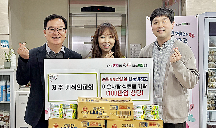 제주 기적의교회(목사 김성빈)는 지난 14일 노형동주민센터(동장 고광수)에서 운영하는 '솜뽁살레와 나눔냉장고' 창구에 라면과 참치 등 100만원 상당의 식료품을 전달했다.