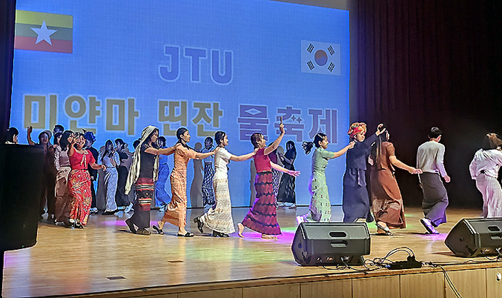 미얀마의 전통 새해맞이 축제인 띤잔 물축제는 매년 4월 중순에 열린다. 물을 뿌리며 묵은해의 액운을 씻어내고 새로운 시작을 기원하는 의미를 담고 있으며, 가족과 이웃, 관광객이 함께 어울려 즐기는 대표적인 문화 행사다. 제주관광대 국제교류원 주관으로 열린 축제에선 물을 활용한 다양한 체험 프로그램과 문화 공연이 진행됐다. 호텔외식조리과 교수와 학생들은 미얀마 유학생이 선호하는 불고기덮밥과 떡볶이 등을 제공하기도 했다. 현재 제주관광대에는 미얀마 유학생 87명이 재학 중이다.