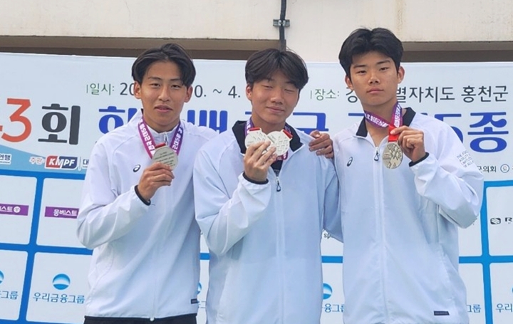 남고부 근대3종에 출전한 박진우(제주사대부고 1년)는 수영 307점, 레이저런 603점으로 총 910점을 기록, 강력한 경쟁자들과의 접전 끝에 은메달을 차지하며 제주 근대5종의 차세대 에이스로서 가능성을 입증했다. 단체전에서도 신현규·강지민(이상 제주사대부고)과 함께 2675점을 합작하며 경북체고에 이어 은메달을 추가, 팀 경쟁력 역시 전국 정상급 수준임을 보여줬다. 여기에 박진우는 이시하(제주사대부고 3년)와 호흡을 맞춘 혼성릴레이에서도 동메달을 더하며 고등부는 1개 대회 3개 메달이라는 눈부신 성과를 냈다.