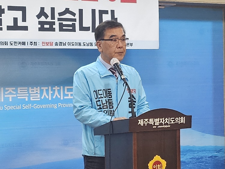 진보당 송경남 예비후보가 21일 제주도의회 도민카페에서 기자회견을 가졌다. 오소범기자