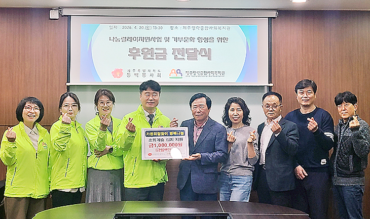 제주특별자치도동백봉사회(회장 김상태)는 지난 20일 제주영락종합사회복지관(관장 강영수)에 소외계층 김치지원사업을 위한 후원금 100만원을 전달했다. 봉사회는 창립 이래로 매달 꾸준히 봉사를 이어가고 있다.
