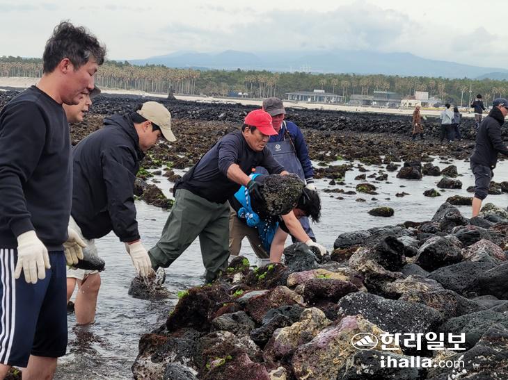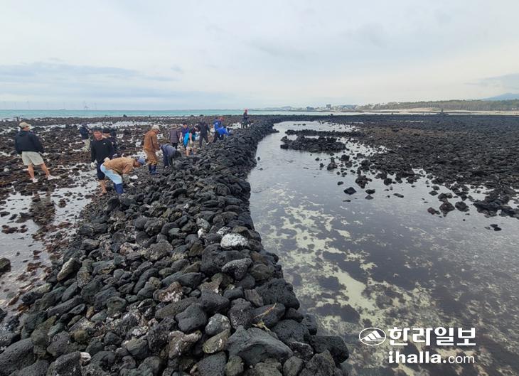 지난 18일 오후 제주시 한림읍 금능원담에서 원담 보수 작업을 하는 '원담지기' 이상수씨와 금능리마을회와 청년회, 돌빛나예술학교 돌챙이들, 제주대 돌담동아리 '돌보다' 대학생들. 박소정기자