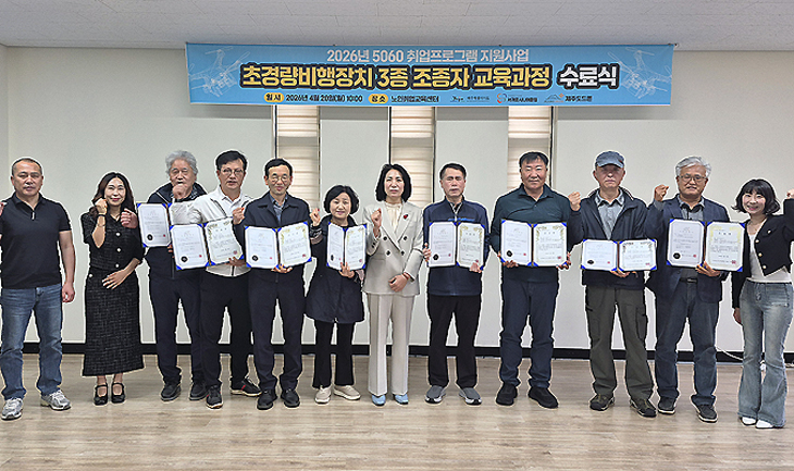서귀포시니어클럽(관장 이은경)은 지난 20일 서귀포시노인복지지원센터에서 '5060 취업프로그램 지원사업 초경량비행장치 3종 조종자교육과정' 수료식을 개최했다.
