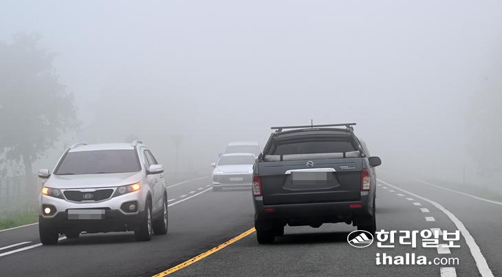 [한라일보] 28일 제주시 용강동 제주마방목지 516도로 일대에 짙은 안개가 끼어 자동차들이 서행하고 있다.