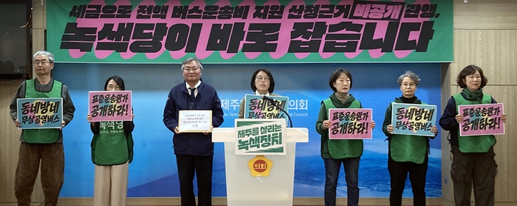 녹색당은 29일 제주도의회 도민카페에서 기자회견을 열고 "버스 준공영제의 투명성과 적정성을 확인하기 위해 제주도에 표준운송원가 산정용역 최종보고서 공개를 청구했지만 비공개 처분을 받았다"며 법원에 '표준운송원가 산정 용역 최종보고서에 관한 정보공개거부처분 취소' 행정소송을 제기한다고 밝혔다.