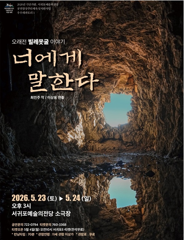 [한라일보] "오래전 빌레못굴에서 무슨 일이 있었는지 내 이야기 한번 들어볼래?" 극단가람이 관객들에게 이런 말을 던지며 제주4·3을 다룬 연극 '너에게 말한다'를 선보인다. 오는 5월 23~24일 오후 3시 서귀포예술의전당 소극장에서다.