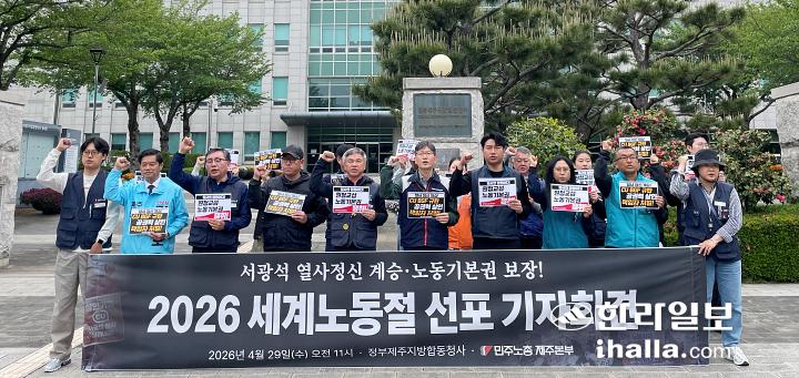 민주노총 제주본부는 29일 오전 제주지방합동청사 앞에서 ‘2026 세계노동절 선포 기자회견’을 개최했다. 양유리기자
