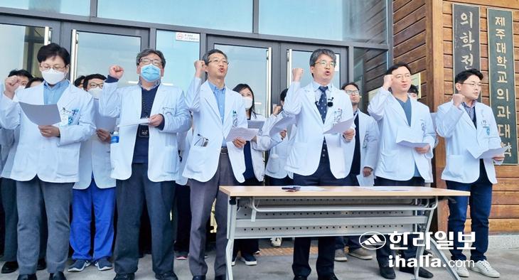 제주대학교 의과대학 교수협의회가 지난달 15일 의대 정문 앞에서 기자회견을 열어 의대 정원 확대를 규탄하는 구호를 외치고 있다. 한라일보DB