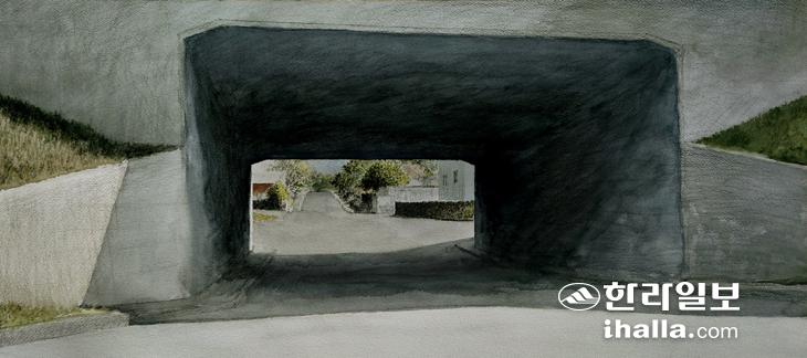 평화로 확포장으로 발생한 굴다리다. 폭이 넓어서 터널 같은 기분이 든다. 저 안에서 들려오는 말소리가 공명을 이루며 밖으로 흘러나오는 것 같은 상징적 느낌을 받았기에 그린 것이다. 강인종 어르신이 21살 나이에 결혼을 하고 개척정신이 투철했던 청년은 아내에게 양잠단지로 이주해서 멋있는 미래를 개척하자고 통보(?)한다. 낭군님의 뜻에 따라 함께 이주하여 모든 것을 새롭게 일궈야 하는 살림살이를 도맡아 하면서도 궂은소리 한 번 해본 적 없는 아내의 삶. 성실하고 끈질긴 성격의 남편을 믿고 양잠농업을 함께 하다가 10년도 되지 않은 시기에 정부에서 수매를 하지 않게 되는 청천벽력 같은 상황이 밀려왔을 때. 마을 아낙네들처럼 앞날에 대한 막막함에 살림살이를 하는 아내는 내색을 못하지만 남편의 표정만 바라볼 뿐. 그러던 어느 날 낙심한 남편을 향하여 조심스럽게 말을 꺼낸다.