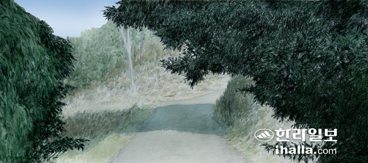 오르막과 내리막이 많은 마을이다. 중산간 지대의 전형적인 특징이겠거니와 설촌 시기의 정취를 찾아 돌아다니다가 겨울이지만 짙은 초록잎 나무가 길가로 뻗어 나온 상황과 마주하게 됐다. 뽕나무의 그 초록색을 아니로되 저 길을 만들고 수레를 끌며 신바람나게 일하던 청년농부 그 개척자들의 숨결이 느껴져서 그린 것이다. 눈부신 오후의 햇살이 만들어서 길가에 드러누운 긴 그림자. 흔히 '누구의 그림자'라고 하는 표현이 소스라치게 놀란 가슴 속에서 터져나와 과거와 현재를 이어준다. 한 시절 있었던 기억일지언정 그 열정의 나무는 아직도 그림자를 드리운다. 자동차끼리 마주 달려오면 아주 골치아픈 상황이 발생할 정도의 작은 농로가 하나의 기억장치가 돼 전달하고자 하는 메시지를 그린 것이다. 한해를 살고 가는 누런 겨울 풀잎들과 상록수의 과격한 대비 속에서 얻는 묘한 카타르시스가 있다. 파격적인 구도라기 보다는 고의적인 배치다. 초록색 나뭇잎이 화면의 반 이상을 좌우에서 차지하고 그 사이에 어떤 공간적 상황인지 보여주는 구성 속에서 결국 그림으로 전달하고자 하는 것은 주대종소법에 입각해 나무다. 뽕나무의 초록 잎사귀에 대한 그리움. 마을 안쪽 깊은 곳을 걸어 다니다보면 어찌해 전원주택들을 많이 지어서 살게 되는 지 그 이유를 알게 된다. 조그만 걸어 나가면 마을 전체가 하나의 공원이라는 생각이 들 정도이니 그러하다. 주거공간이 자연 속에 있다는 느낌을 받게 되는 묘한 느낌의 마을. 새소리는 그릴 수 없어서 안타깝지만.