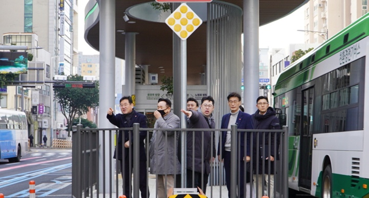 1일 제주자치도의회 의원들과 서광로 섬식 정류장을 찾은 문대림 국회의원.