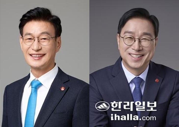 민주당 제주지사 경선 문대림 후보와 위성곤 후보(왼쪽부터).
