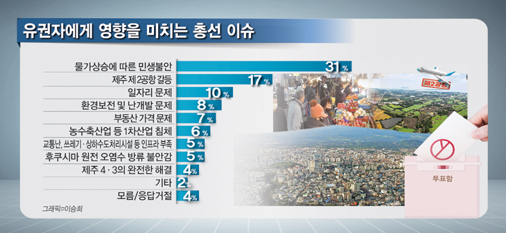 [한라일보] 제22대 국회의원선거에서 가장 큰 영향을 미칠 제주지역 이슈는 물가상승에 따른 민생불안으로 꼽혔다. 최근 고물가, 고유가, 고금리 등으로 서민경제가 악화되면서 이를 극복할 수 있는 대안, 공약 등에 대한 도민들…