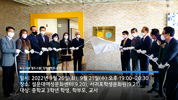 9월 2주 제주교육 소식 1. 표선고(IB 월드스쿨) 입학설명회 운영 ‣ 일시: 2022. 9. 20.(화), 9. 21.(수) 19:00~20:30 ‣ 장소: 설문대여성문화센터(9.20.), 서귀포학생문화원(9.21.) ‣ 대상: 중학교 3학년 학생, 학부모, 교사 (문의: …