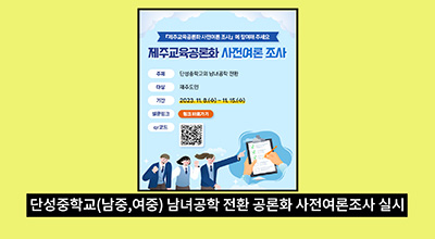*이 영상은 제주특별자치도 교육청 지원을 받아 제작되었습니다. *11월 3주 제주교육 소식 1. 단성중학교(남중,여중)의 남녀공학 전환 공론화 사전여론조사 실시 ‣ 대상: 제주도민 ‣ 기간: 2023. 11. 8.(수)~15.(수) ‣ 방법: …