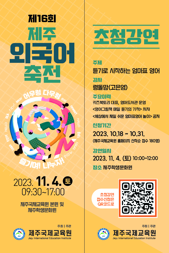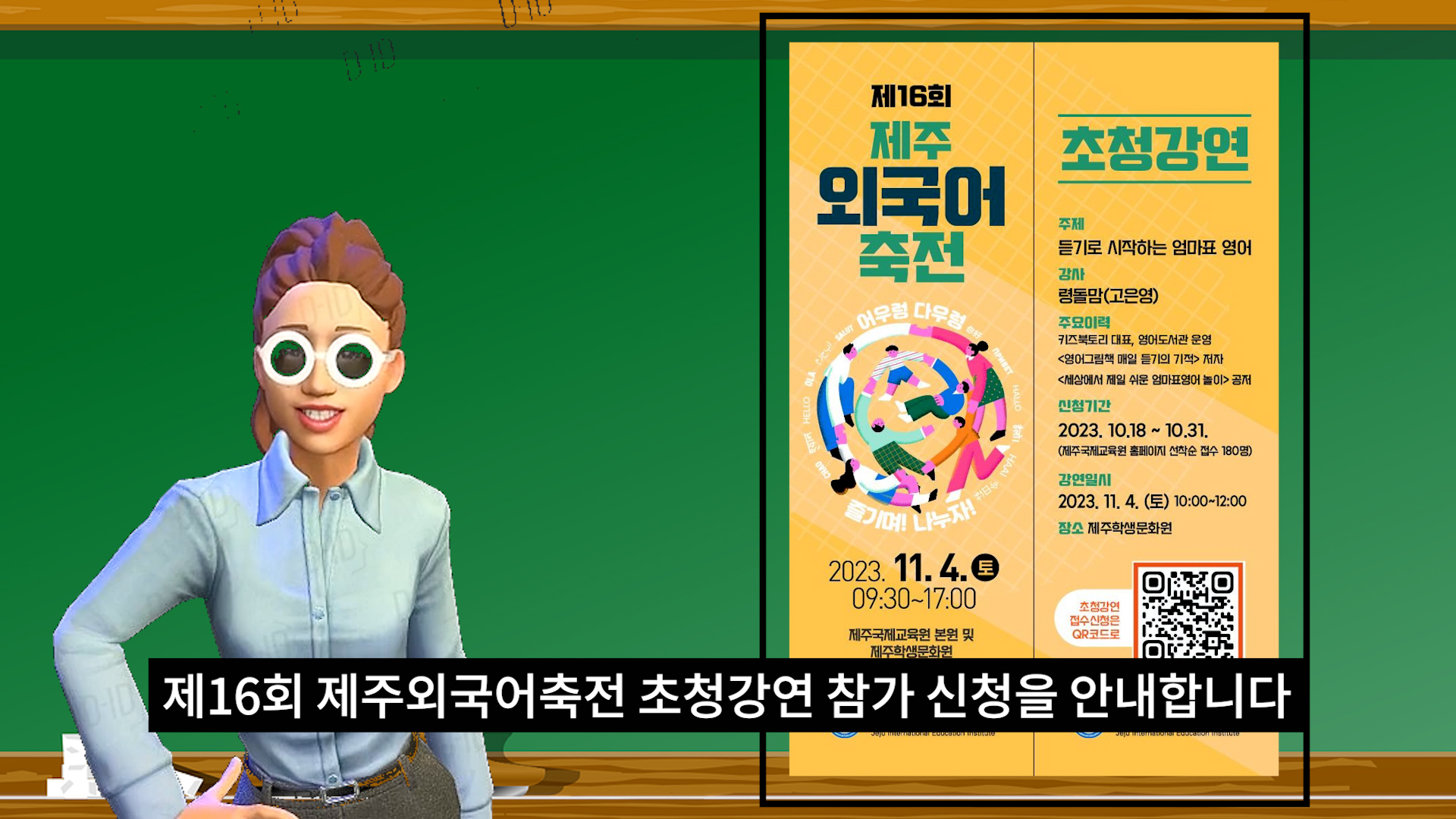 *이 영상은 제주특별자치도 교육청 지원을 받아 제작되었습니다. *10월 4주 제주교육 소식 1. 제16회 제주외국어축전 초청강연 참가 신청 안내 ‣ 주 제: 듣기로 시작하는 엄마표 영어 ‣ 일 시: 2023. 11. 4.(토) [참가등록] 09…
