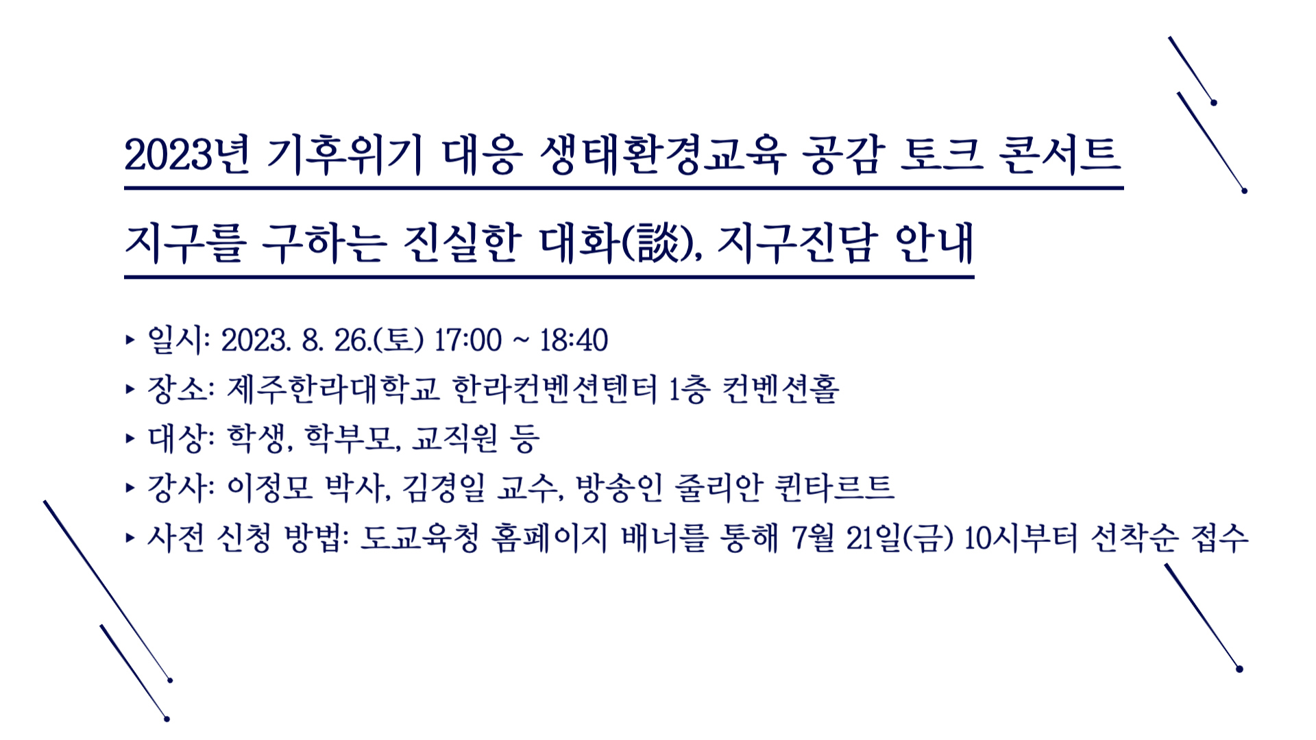 1. 2023년 기후위기 대응 생태환경교육 공감 토크 콘서트 「지구를 구하는 진실한 대화(談), 지구진담」안내 ‣ 일시: 2023. 8. 26.(토) 17:00 ~ 18:40 ‣ 장소: 제주한라대학교 한라컨벤션텐터 1층 컨벤션홀 ‣ 대상: 학생, 학부모, 교…